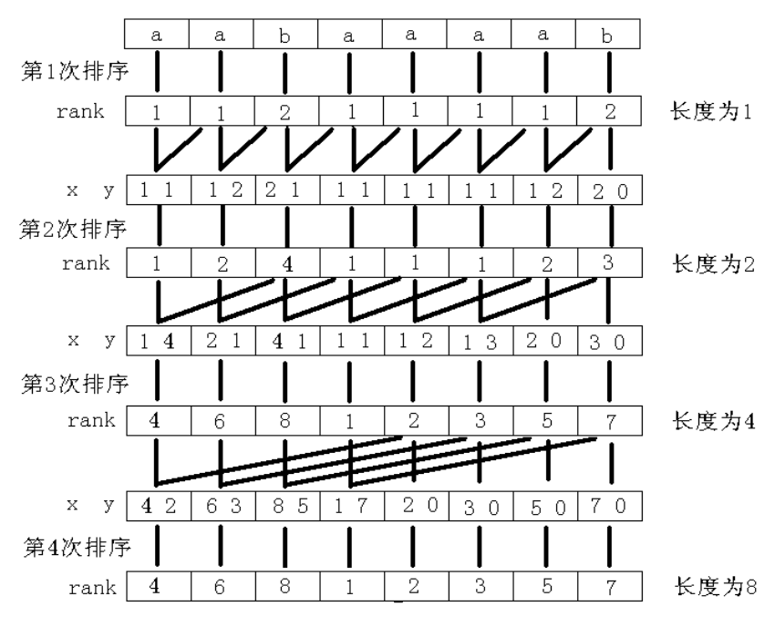 rk[i] — 这一轮后缀 \(i\) 的排名sa[i] — 这一轮排名 \(i\) 后缀开始的位置tp[i] — 上一轮后缀 \(i\) 的排名\(p\) — 已经排出的不同排名个这一部分就一起解释吧。